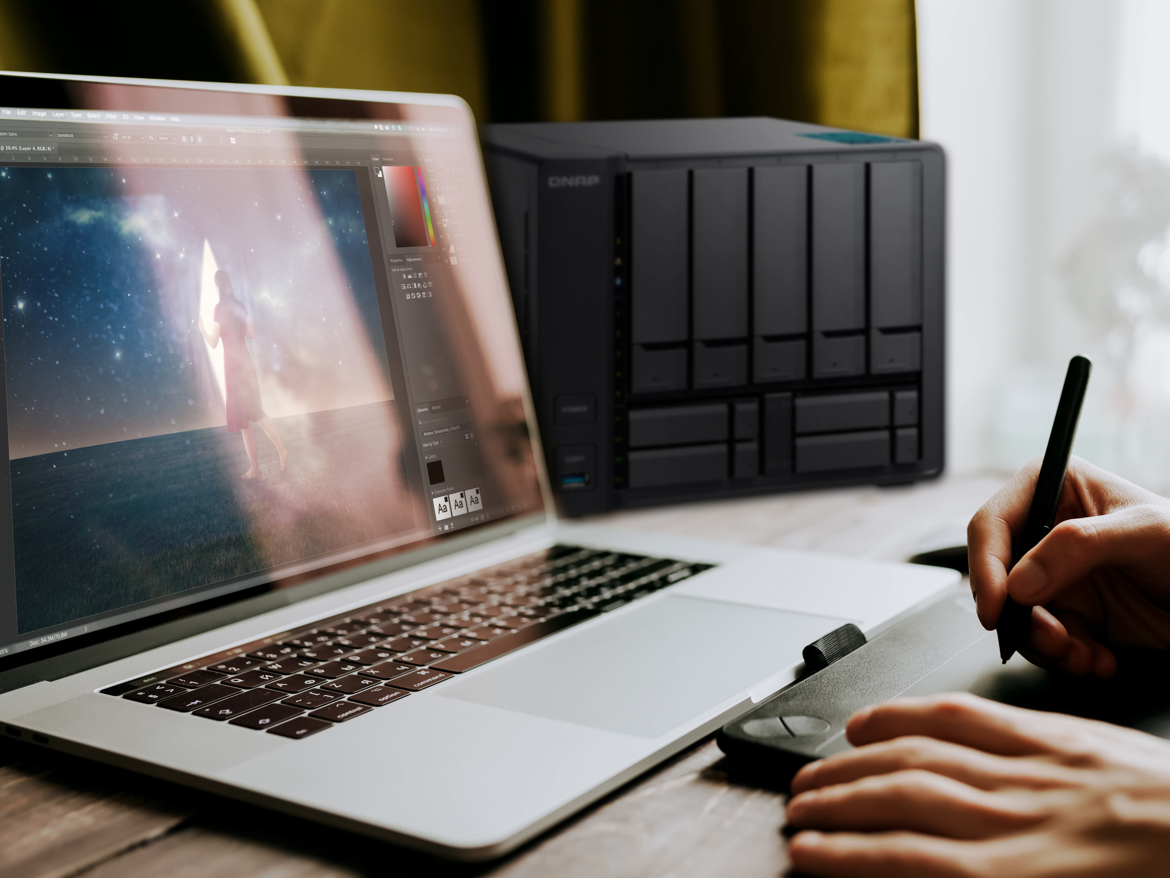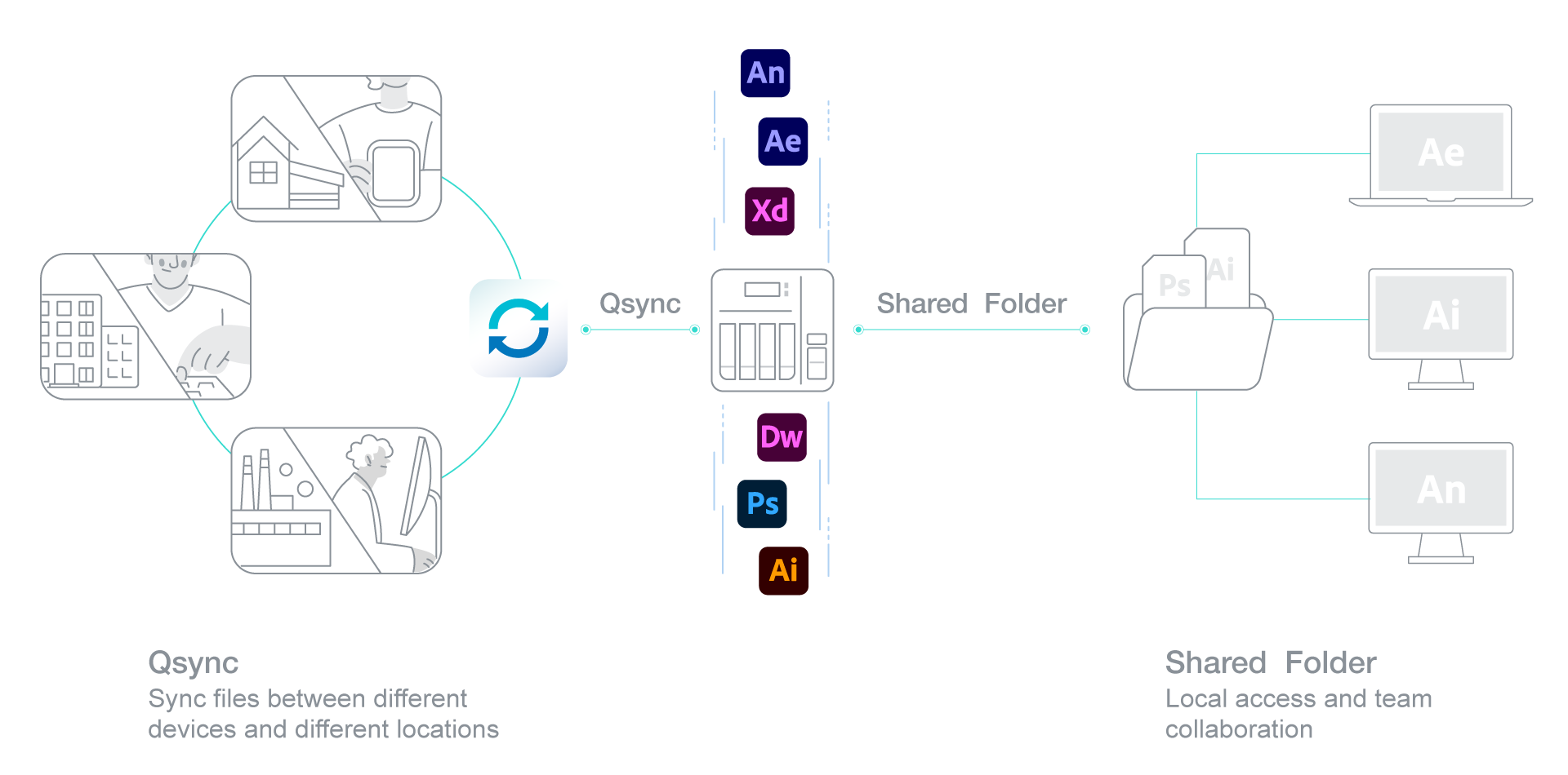O NAS QNAP permite que os criadores Adobe criem rapidamente um centro de colaboração para armazenar e aceder a ficheiros multimédia. Os ficheiros RAW e os ficheiros finalizados também podem ser facilmente sincronizados entre equipas distribuídas por todo o mundo.