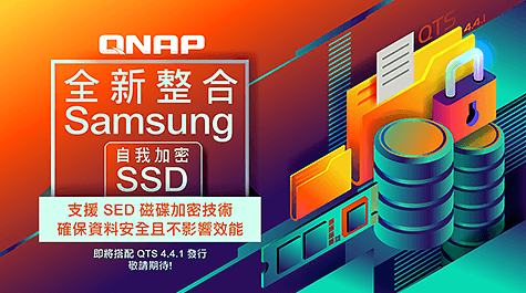 硬碟遺失是不可預測的風險,QTS 4.4.1 支援 SED 自我加密硬碟 (Self Encrypting Drive),只要使用內建 SED 技術的 SSD (例如 Samsung 860 及 970 EVO SSD 固態硬碟),即可使用 SSD 內建的加密處理器為資料進行加密。無需耗用 NAS 運算資源,亦不須額外安裝任何軟體,即可為整顆 SSD 進行加密,為資訊安全再添一層保障。