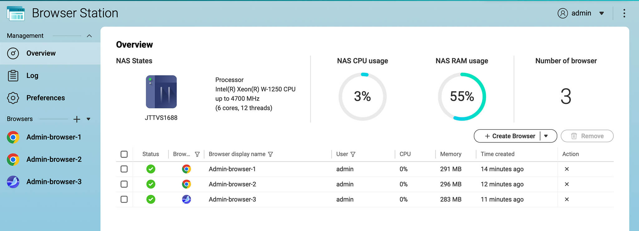 The easy-to-use management interface enables you to open multiple browsers in a single interface, and also to easily manage all of the browsers by viewing their real-time information, including users, NAS system utilization, time created, logs, and more.
