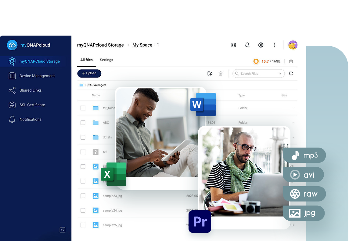 Save documents, photos, and videos to the scalable myQNAPcloud Storage. Your free 16 GB storage space is available now!