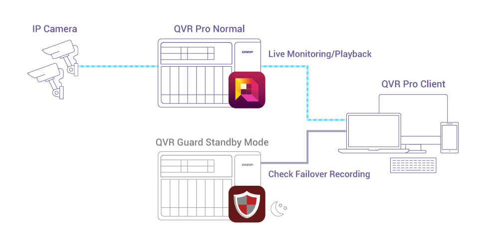QVR Guard es una aplicación de gestión de conmutación por error de alta disponibilidad para proteger QVR Pro contra fallos del sistema y para garantizar grabaciones de video vigilancia ininterrumpidas. QVR Guard cuenta con una funcionalidad de conmutación por error que asume automáticamente las tareas de grabación de un servidor QVR Pro en caso de que se produzca un fallo inesperado del sistema o del hardware (cada NAS que ejecute QVR Guard puede servir como servidor de conmutación por error para un NAS que ejecute QVR Pro). Los archivos de grabación se guardan en el NAS QVR Guard hasta que el sistema QVR Pro se reinicia y funciona normalmente. QVR Guard proporciona una redundancia fiable para QVR Pro, asegurando grabaciones de vigilancia ininterrumpidas.