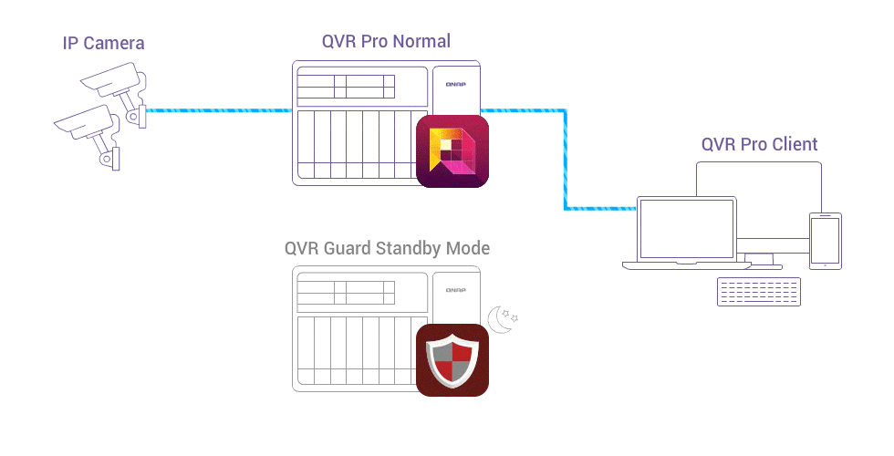 QVR Guard se encarga automáticamente de las tareas de grabación cuando el servidor QVR Pro no puede garantizar grabaciones de vigilancia ininterrumpidas.