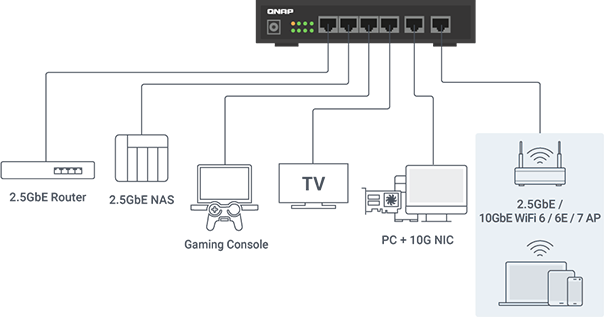 This switch, featuring both 2.5GbE and 10GbE ports, lets you experience ultra-fast 10GbE speeds at a 2.5GbE budget. With NBASE-T RJ45 ports, you can upgrade instantly using your existing network cables (CAT5e/CAT6/CAT7 RJ45). Effortlessly connect your PC, laptop, NAS, streaming box, Wi-Fi 6/6E/7 AP, and more. |