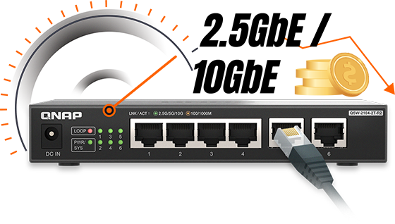 省荷包!2.5GbE 交換器價,即享 10GbE 網速,且不須另買光纖線材 好簡單!隨插即用免設定,享受穩定連線跟高效大檔傳輸 好安心!輕巧桌上型設計,靜音、節能、低電磁干擾