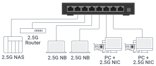 提供 8 埠 2.5GbE 網路,讓家庭與辦公室網路全面升級,隨插即用、無痛導入! |