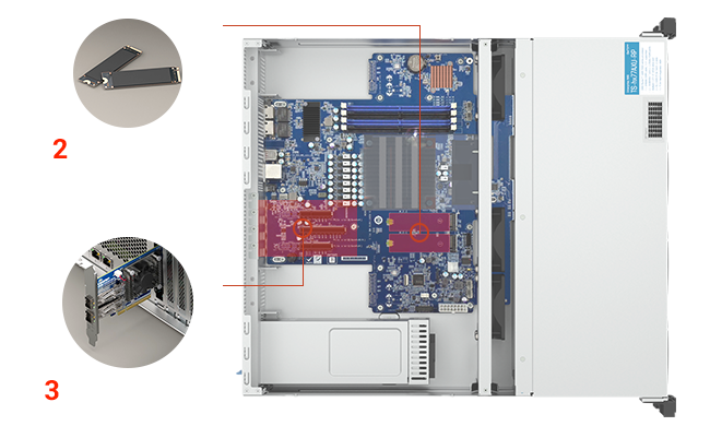 | Supports 10/25GbE NICs, GPU, QM2 M.2, and storage expansion cards. |