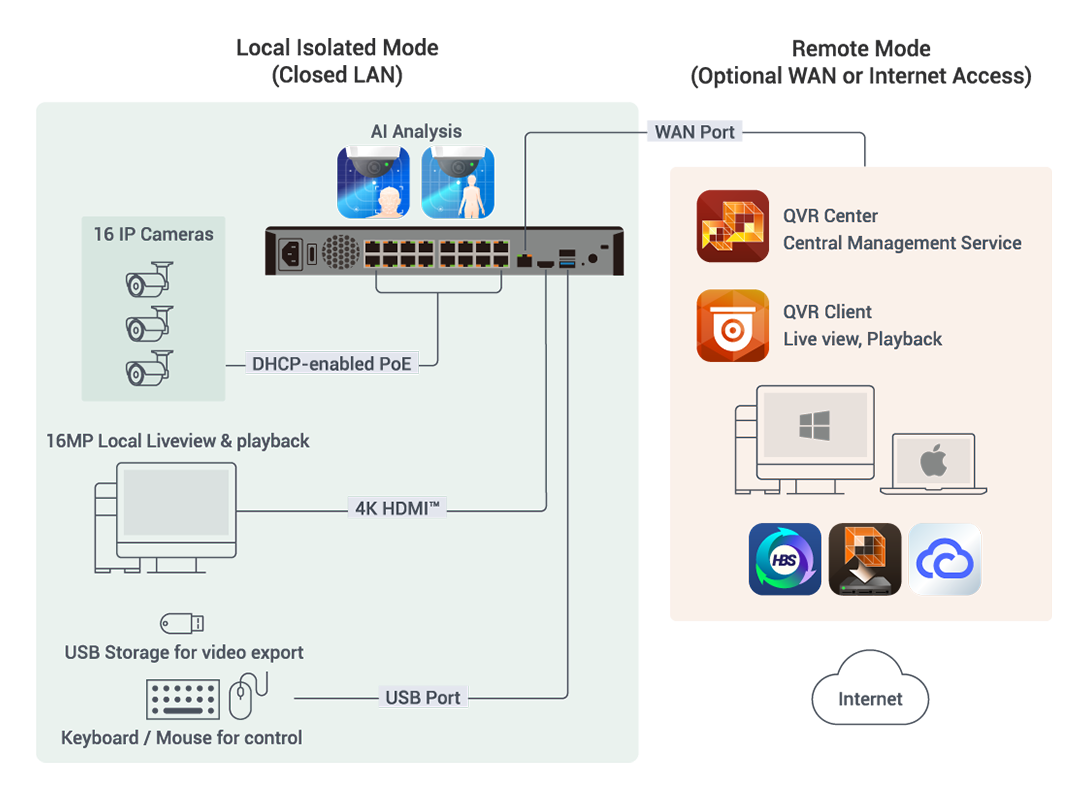 中小型企業環境最怕資安威脅,TVR-AI200 支援離線運行,資料不經雲端即可保存,避免額外風險。也可視需求啟用 WAN 遠端管理與備份。 |