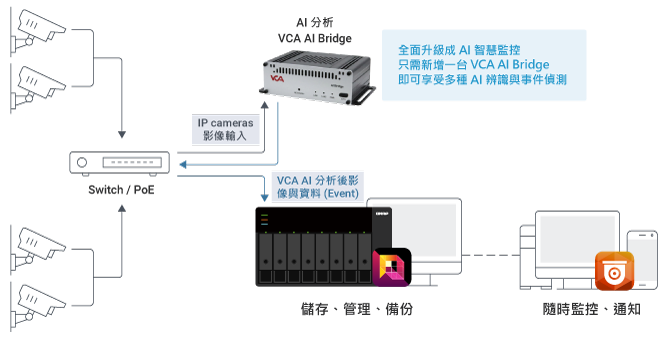 市面上想升級 AI 通常得更換整套監控設備,成本高、時間長。QNAP x VCA 解決方案只需加裝一台 VCA AI Bridge,就能將既有攝影機秒變智慧 AI Cam,不用大規模重新佈線或設定,大幅節省預算與施工人力。 |