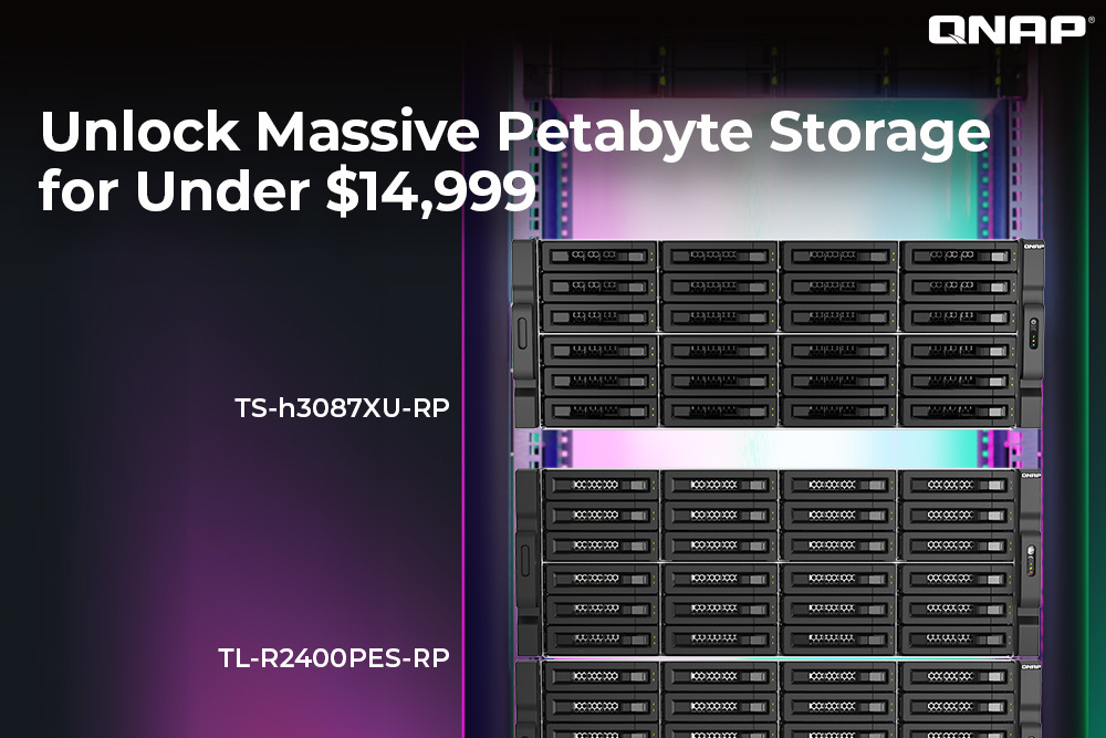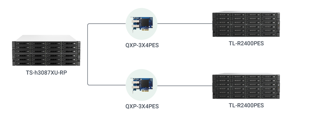 Achieve petabyte-scale storage for under $14,999* with QNAP’s Intel® Xeon® powered NAS, the TS-h3087XU-RP and two TL-R2400PES-RP expansion units. The TS-h3087XU-RP combines 24 3.5-inch drive bays for high-capacity HDDs and 6 2.5-inch bays ideal for SSD storage to support high IOPS and low latency. The two expansion units connect via the PCIe expansion slots using the QXP-3X4PES cards. *Not including drives |