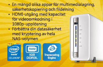 TS-251C: Tornmodell med 2 fack, dubbelkärnig Intel® Celeron® -processor på 2,41 GHz, DDR3L RAM-minne på 1 GB; SATA-hårddiskar (3,5-tums); USB 3.0 (1 st.); USB 2.0 (2 st.); gigabit-LAN-port (1 st.); HDMI-utgång (v1.4a, 1080p)