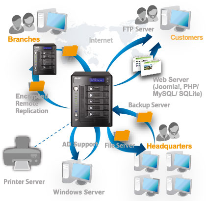 Modern business requires a centralized data center to protect information asset, back up critical data, share the information among workgroups or departments. A solid, efficient, and flexible data backup system is the key to greater business agility and also an increasingly important task for IT administrator. QNAP TS-509 Pro Turbo NAS is the new generation all-in-one NAS server for SMB and enterprises. It offers the most reliable and powerful storage solution. With superior performance, versatile server features, best-in-class RAID data protection, and rock-solid hot-swappable hard drive design, the TS-509 Pro brings business nowadays a truly new experience of instant data access and sharing, a protected mass storage, value-plus server features at the lowest maintenance cost.