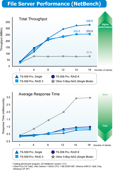 The test results show that TS-509 Pro delivers superior performance (over 300Mbps when serving 16 clients), under single disk configuration. The throughput of other NAS brands of the same level only reaches a half or less than that of QNAP TS-509 Pro. It reflects the TS-509 Pro's capability as the best file server solution in a business environment.