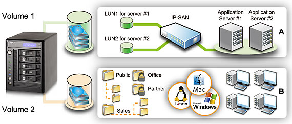 The TS-509 Pro can serve as a NAS and an iSCSI target server. The built-in iSCSI target feature provides an affordable IP-SAN (Storage Area Network) alternative for SMB. The server managers can set up the NAS to expand the storage capacity for existing application servers, such as database server and mail server in an economic way. Moreover, the innovative "Virtual Space Allocation" (Thin Provisioning) feature is provided which allows the server managers to flexibly allocate the capacity of iSCSI LUN (Logical Unit Number) at the beginning regardless of the physical volume capacity.