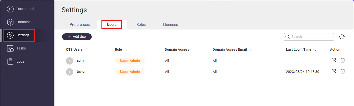 When adding a new user, you must assign a user role. Depending on the user role selected, you can assign one, multiple, or all domains to the user for access. You can also change an existing user's role and domain assignments any time.