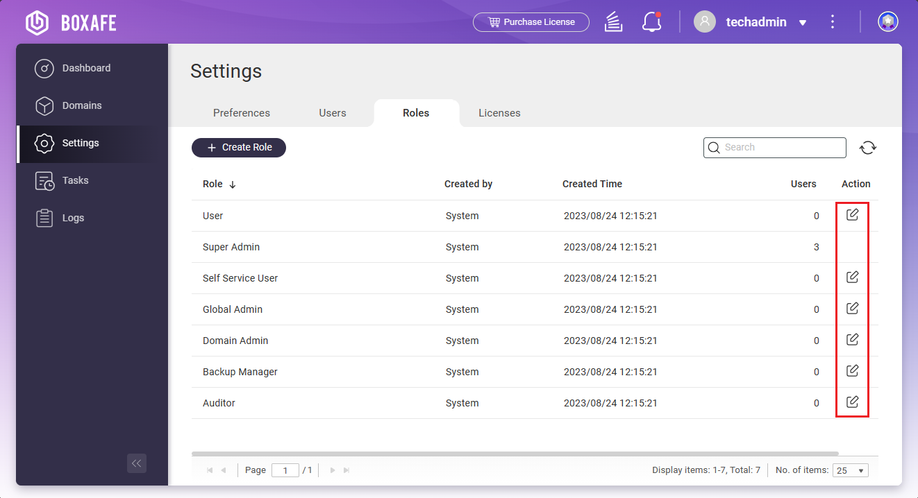 To view the full details of a user role's permission settings, click the corresponding Edit icon under Action.