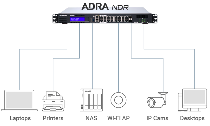 "Thông qua các cổng LAN, QNAP ADRA NDR cung cấp bảo mật cho NAS kết nối mạng bằng cách phát hiện nhanh chóng ransomware và các mối đe dọa tương tự."