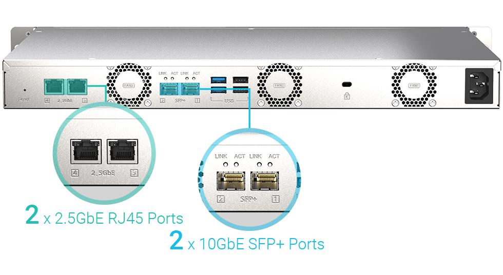 TS-435XeU có hai cổng 10GbE SFP+ và hai cổng 2.5GbE RJ45 cho mạng tốc độ cao để đáp ứng các ứng dụng yêu cầu băng thông (bao gồm truyền tệp lớn, sao lưu/khôi phục tốc độ cao, container và truyền tải đa phương tiện) với sự hỗ trợ của ghép cổng và cân bằng tải. Các switch 2.5GbE/10GbE có quản lý và không quản lý của QNAP là sự kết hợp hoàn hảo cho các tổ chức xây dựng mạng tốc độ cao tiết kiệm chi phí cho sự hợp tác nhóm hiệu quả.