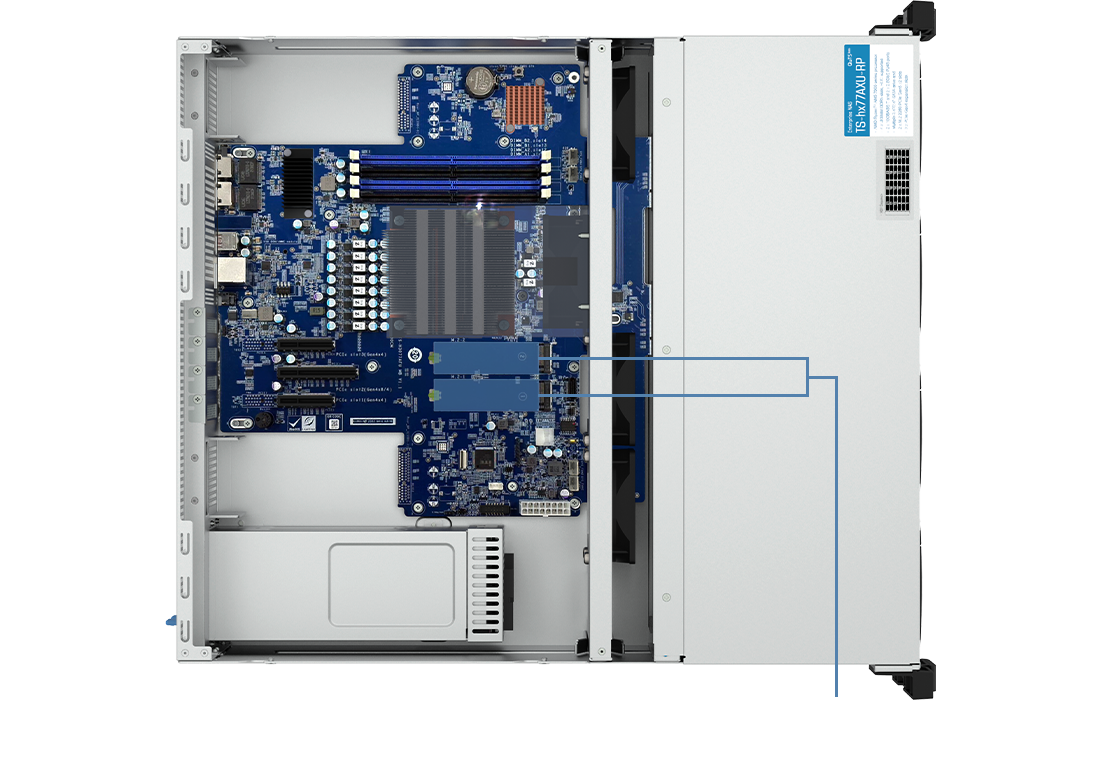 TS-h2477AXU-RP có hai khe M.2 2280 PCIe Gen 5 hỗ trợ NVMe SSD cho tốc độ đọc/ghi vượt trội. PCIe Gen 5 tương thích ngược với PCIe Gen 4 và Gen 3, cung cấp hiệu suất Lưu trữ linh hoạt và các tùy chọn mở rộng.