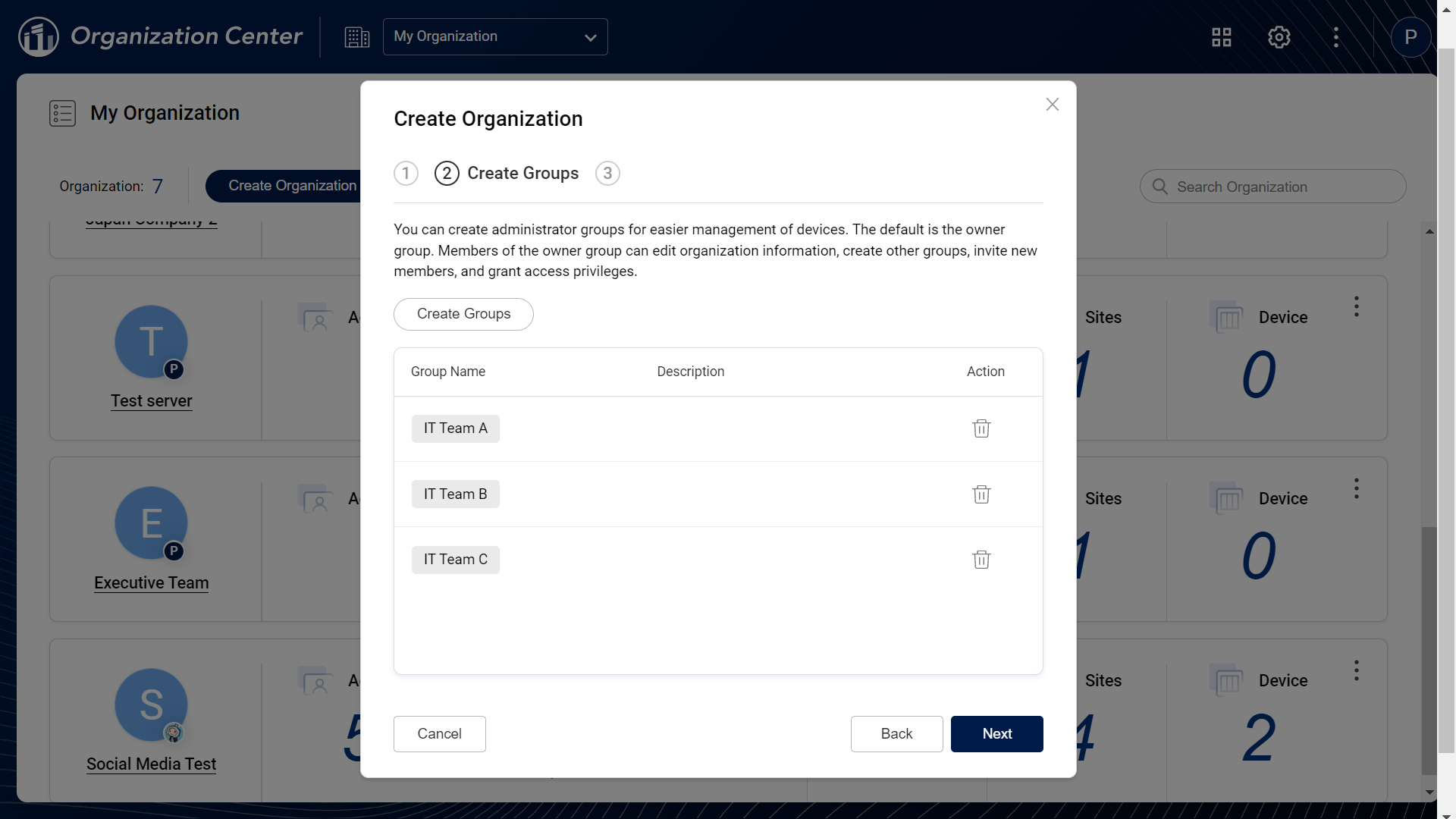 Create organizations, sites, admin groups, then invite members to join and grant proper management authority in the Organization Center. Layered teamwork for collaborative management helps maximize IT management efficiency.