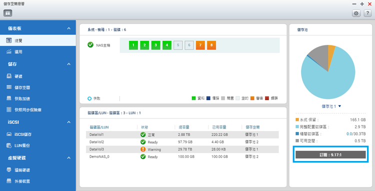 [訂閱]是用來顯示系統內已宣告之儲存空間與實際可用空間的比例。例如,當使用者建立一精簡配置(Thin provisioning)的磁碟區,其宣告空間為10TB,但實際可用空間為1TB,則該精簡配置空間即超過訂閱(Oversubscribed)。因此在總覽頁面,該訂閱會顯示為10:1,以提醒使用者要注意儲存空間的使用情況。