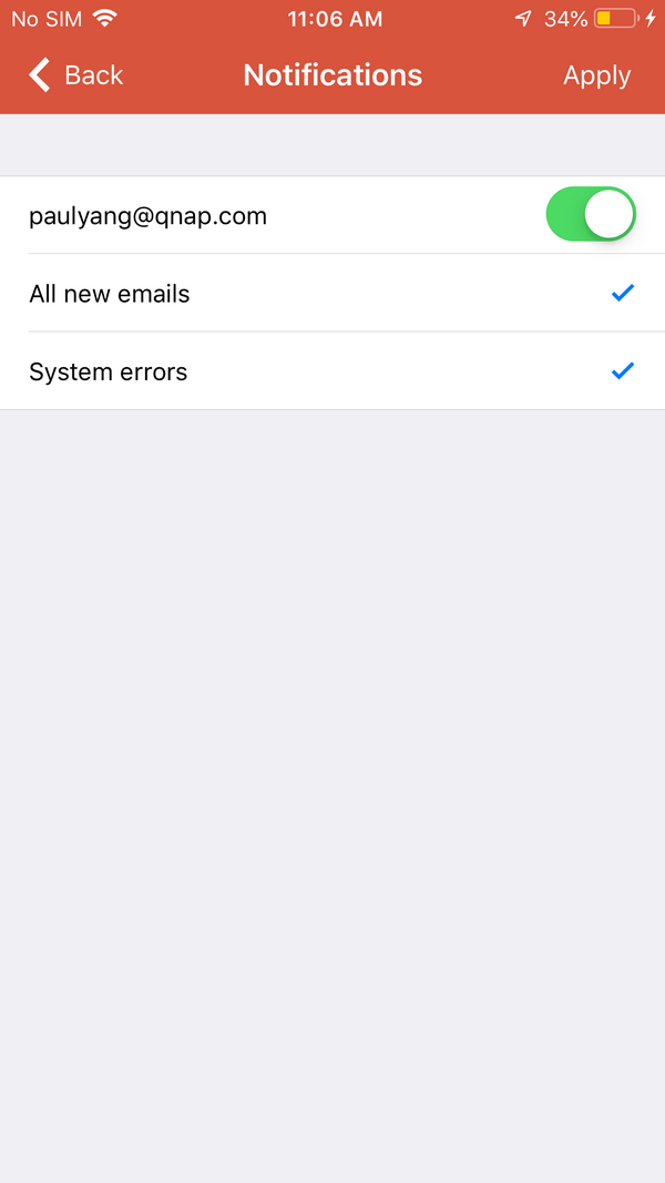 - 在〔推播通知〕中,您可選擇電子郵件帳號要接收的通知項目(新電子郵件或系統錯誤)。