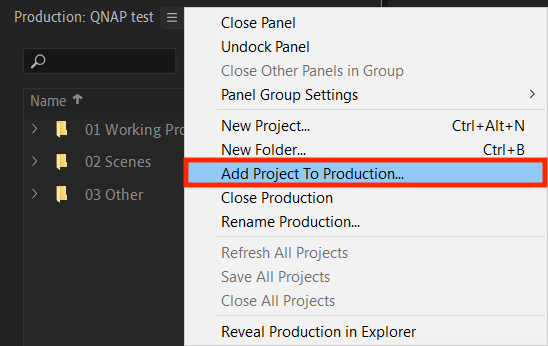 在 Production 面板上按一下滑鼠右鍵,或在 Production 面板功能表選擇[Add Project to Production(將專案加入製片流程中),然後選擇磁碟上的專案。