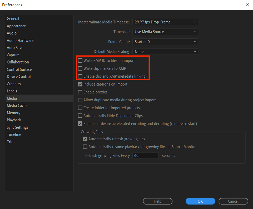 在 Windows 的[Edit(編輯)]>[Preferences(偏好設定)]或在 Mac 的[Premiere Pro]>[Preferences(偏好設定)]對話方塊中設定下列偏好設定。