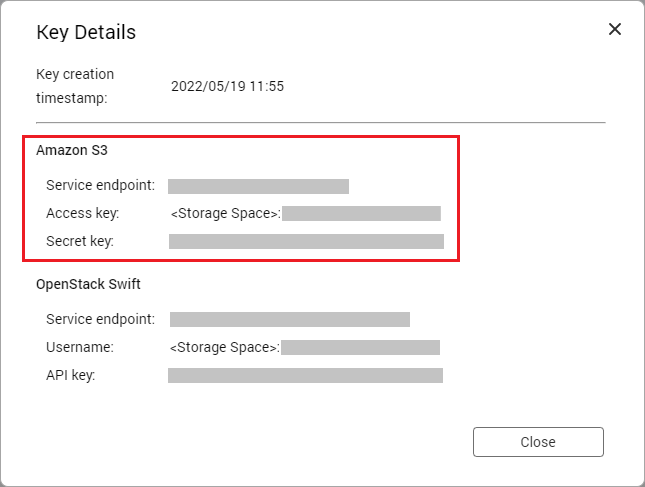 在 QuObjects 中,您可以為每個使用者建立多個存取金鑰,並為每個儲存空間或專案指派不同的金鑰。如果存取金鑰洩露,您可以刪除該金鑰而不會影響其他儲存空間或專案。QNAP 建議定期更換較舊的存取金鑰。