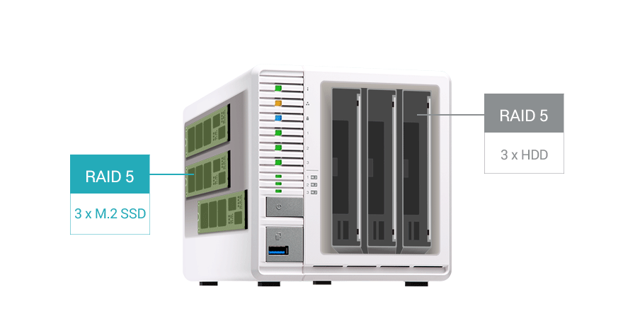 TS-332X 支援 3顆硬碟,更內建 3 個 M.2 SSD 專用埠,可安裝輕巧 2280 尺寸的 SATA 6Gb/s M.2 SSD (需選購),提供混合式 (HDD + SSD) 架構,讓您一次享有大容量 SATA 硬碟的儲存空間及高效能 SSD 的存取表現。此外,3 顆硬碟及 3個M.2 SSD 專用埠皆可建立 RAID 5 磁碟陣列,兼顧效能與資料備援保護。