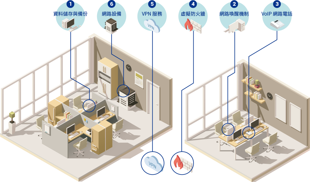 首先,您必須為所有同事準備一個集中儲存的檔案伺服器。辦公室內的 IP 印表機、VoIP 電話等設備皆需要網路連線。建立防火牆避免外部入侵攻擊及內部網路攻擊是資安必要措施。您與其他遠端辦公室的同事們,您也需要 VPN 連線,滿足安全且隱密的遠距資料交換需求。