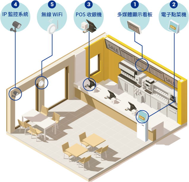 您可能希望可以使用數位顯示看板,來彈性地展示您的新菜單或促銷資訊。您也需要時時確認 POS 機系統保持連線,並能妥善儲存 POS 系統資料。您也需要配置 NVR 監控系統,不僅可抑制竊盜確保環境安全,更可解決顧客丟失隨身物品的糾紛。現在的餐廳沒有提供 Wi-Fi 就遜掉了,所以您也需要提供免費 Wi-Fi 給客人使用...