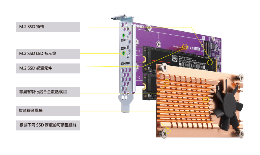 創新 QM2 擴充卡系列可安裝於相容 QNAP NAS 機種的 PCIe 擴充槽,為 NAS 增添 M.2 NVMe SSD 配置。您可啟用 SSD 快取功能,亦可配置快取儲存池或自動分層儲存磁碟區,提升 NAS 整體效能。