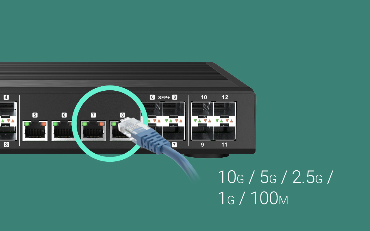 具備 8 個 10GbE SFP+ / RJ45 複合埠,相容 Multi-Gigabit NBASE-T 標準,可支援達五速 (10G / 5G / 2.5G / 1G / 100M) 網路,使用原有線材即可升級網速。