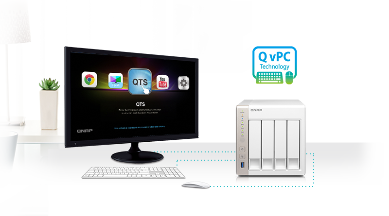 只要將TS-451外接 HDMI™ 顯示器或電視,搭配滑鼠與鍵盤即可透過簡單幾個步驟進行安裝,安裝完成後就能夠立刻在螢幕上使用 QTS 簡單易用的界面來存取您的資料,NAS 也可以成為家中的電腦。