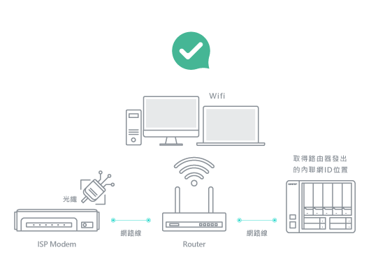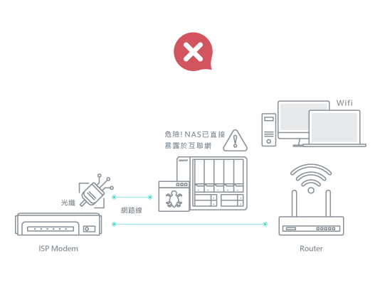 讓 NAS 的網路埠直接連到網際網路,就是不安全。首先,請務必確認您的 NAS 是連接到路由器 (Router) ,再透過路由器連接到網路服務供應商 (ISP) 提供的數據機 (Modem) 及對外網際網路。在正確的設定下,路由器可以為你阻擋來自網際網路的惡意連線,降低網路攻擊風險。
