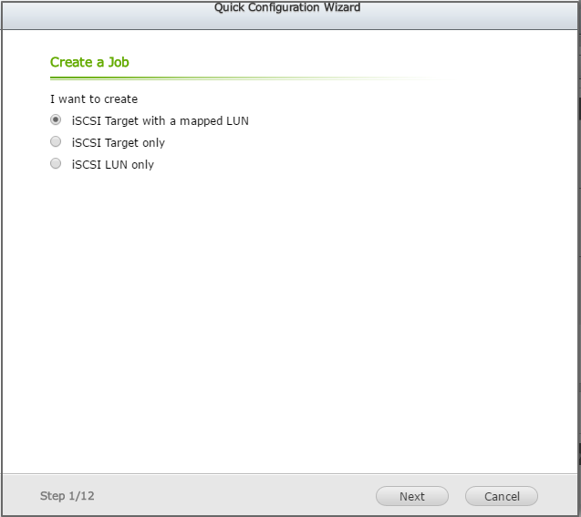 3. 選擇「建立一個 iSCSI 目標並且掛載一個 iSCSI 磁碟」,並按「下一步」。