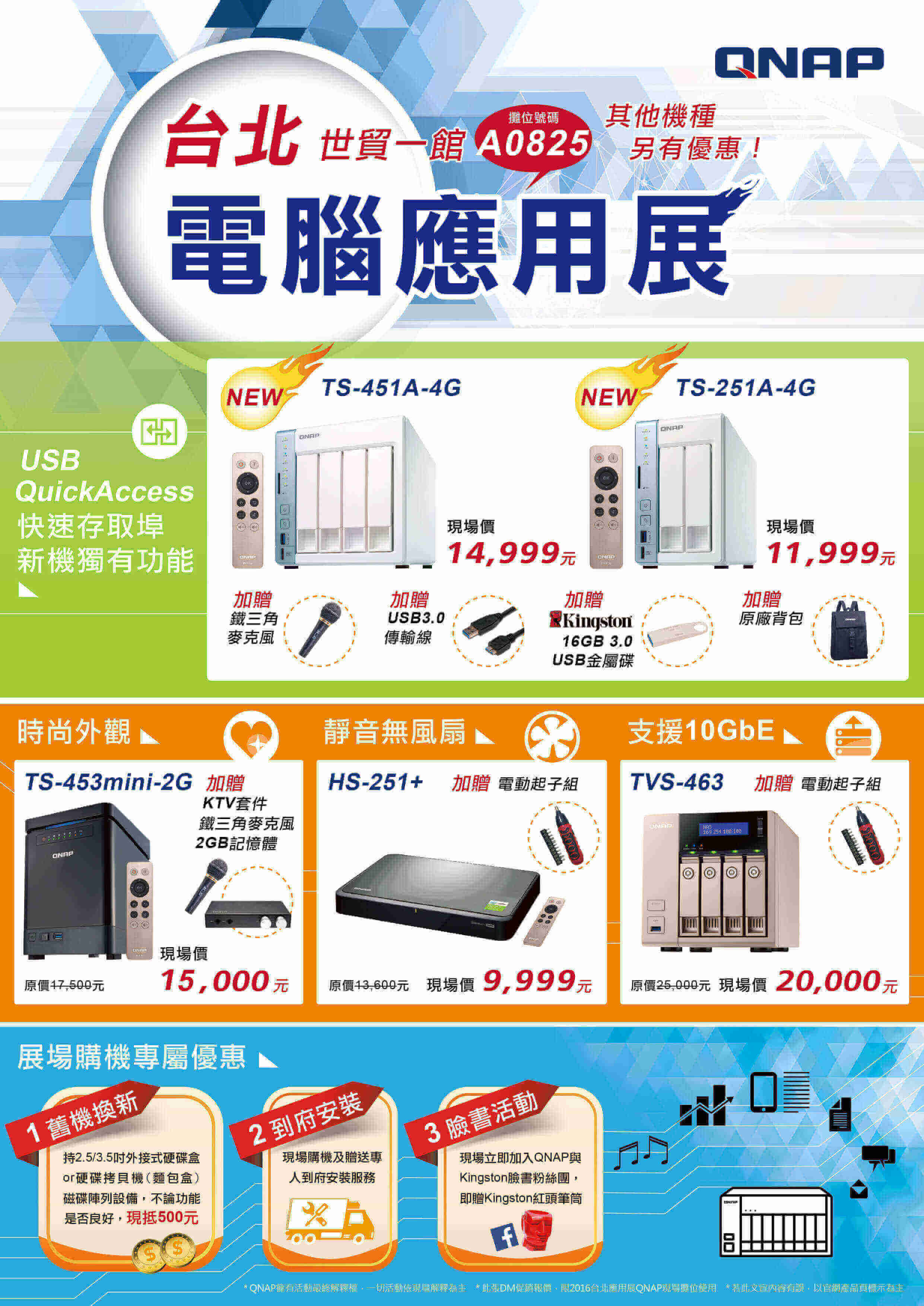 活動現場除了提供 TS-x51A 系列與多款 NAS 的限時優惠價,更有多項現場購機才有的限量贈品,包括:QNAP 原廠紀念背包、電動起子、Kingston 16GB USB 3.0 金屬碟等。其他通路絕無相同優惠,有意採購 NAS 的民眾可以好好把握。QNAP 攤位現場亦提供「舊機換新抵 500」與「現場購機贈送免費到府安裝」活動。