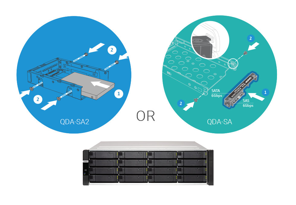 SATA 6Gb/s 介面的 SSD 提供高速且經濟的儲存方案,但受限於 SATA SSD 不支援雙埠,因而無法使用於雙控制器環境。QDA-SA 硬碟轉接座與 QDA-SA2 硬碟轉接盒專為 QNAP Enterprise ZFS NAS 所設計,可將 SAS 訊號轉換成 SATA 6Gb/s 接頭的硬碟槽。藉由 QDA-SA / QDA-SA2 安裝 SATA HDD 或 SSD 於雙控設計的 ES1640dc v2,讓 SATA 硬碟亦具備 SAS Dual-port 容錯功能,為高可用性 (High Availability) 應用提供有力的支援,協助企業組織享有經濟而彈性的儲存配置方案。