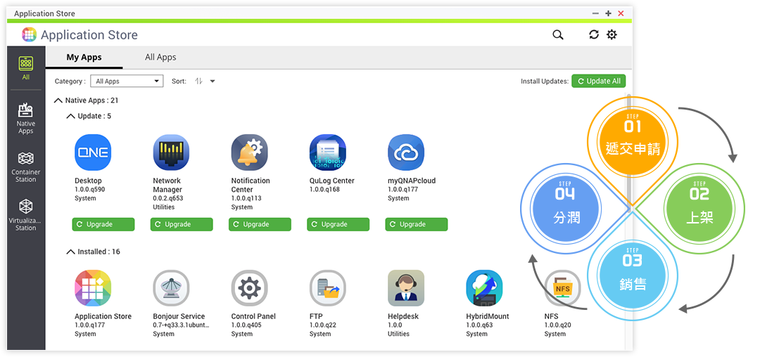QNE Network 繼承了 QNAP QTS 豐富的虛擬化應用,透過虛擬機工作站 (Virtualization Station)、軟體容器工作站 (Container Station),讓 QuCPE 可一機同時運行多台虛擬機與軟體容器應用,並可運行中小企業自行開發的各式虛擬機,為中小企業提升應用部署與管理彈性並降低設備成本支出。