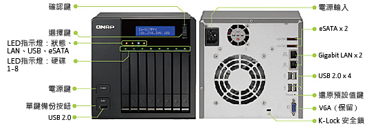 LED 指示燈 | 狀態、網路, USB, eSATA, HDD 1-8 |