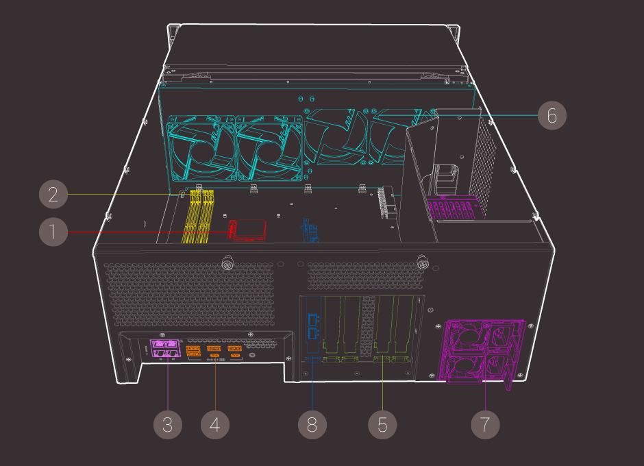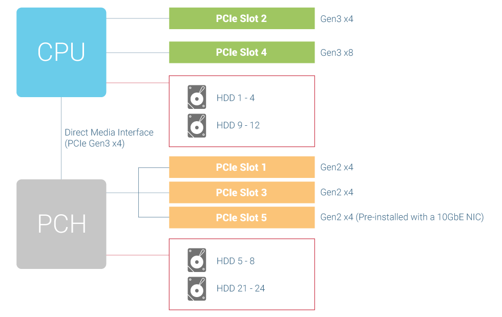 TS-2483XU-RP 提供多個 PCIe 擴充槽,具備高度擴充性。為確保 SATA 硬碟有最充裕的頻寬確保其提供最大效能表現,由平台路徑控制器 (PCH) 引出的 PCIe Gen2 插槽 (Slot 1, 3, 5) 建議使用低速介面的擴充卡,例如:1GbE 網卡、USB 3.2 Gen 1 擴充卡、或無線網路擴充卡等等;而由 CPU 引出的 PCIe Gen3 插槽 (Slot 2, 4) 則可使用高速介面的擴充卡展現優異效能,例如:10GbE/40GbE 網卡、SAS 擴充卡、Mustang-200 運算加速卡、或者 GPU 圖形顯示卡。