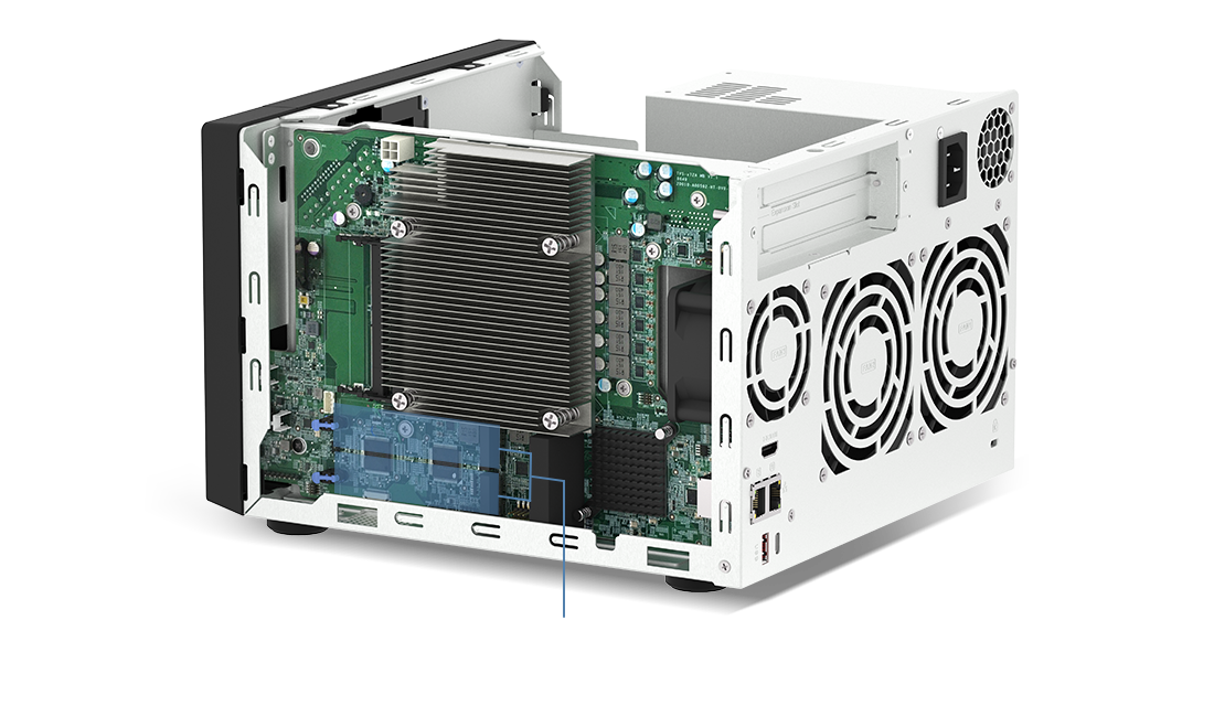 TVS-h674 配備 2 個 M.2 PCIe 專用埠,提升 NAS 效能與應用潛力。