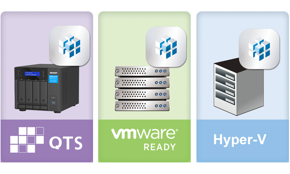 Q'center Virtual Appliance 可安裝、運行於 VMware® ESXi 和 Microsoft® Hyper-V™ 虛擬環境中。毋須特定一台 QNAP NAS 作為硬體伺服器,企業也能使用現有的中央伺服器安裝 Q’center 解決方案。