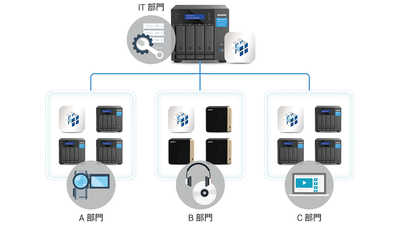 Q’center 突破以往一台伺服器集中管理所有 QNAP NAS 的機制,現在每一台 NAS 都可以被多台安裝 Q’center 的伺服器所共同管理。每個部門或獨立單位可以了解分區儲存空間使用狀態及紀錄,同時滿足中央資源配置與分區管理兩大目標,協助您更有效率地管理 NAS 資產。