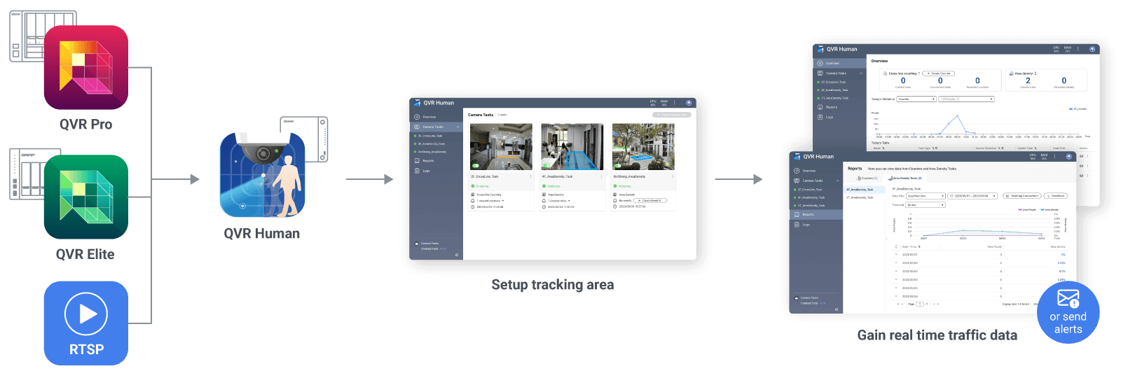QVR Human 分析來自不同來源 (包含 RTSP、QVR Pro 或 QVR Elite 伺服器) 的即時影像串流,讓您輕鬆整合多個監控系統,運用更彈性。還可設定事件通知,當室內人數達到上限時,系統將傳送通知給您。