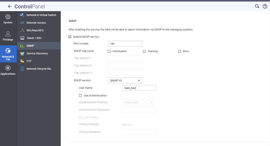 SNMP (簡易網路管理通訊協定) 是一種網路標準協定,可用於收集和交換 IP 網路上受管設備的資訊。只要在一台 QNAP NAS 安裝網路管理系統 (NMS),如:Zabbix、Nagios、PRTG,即可集中管理及監控在網路環境中所有啟用 SNMP 協定的設備。
